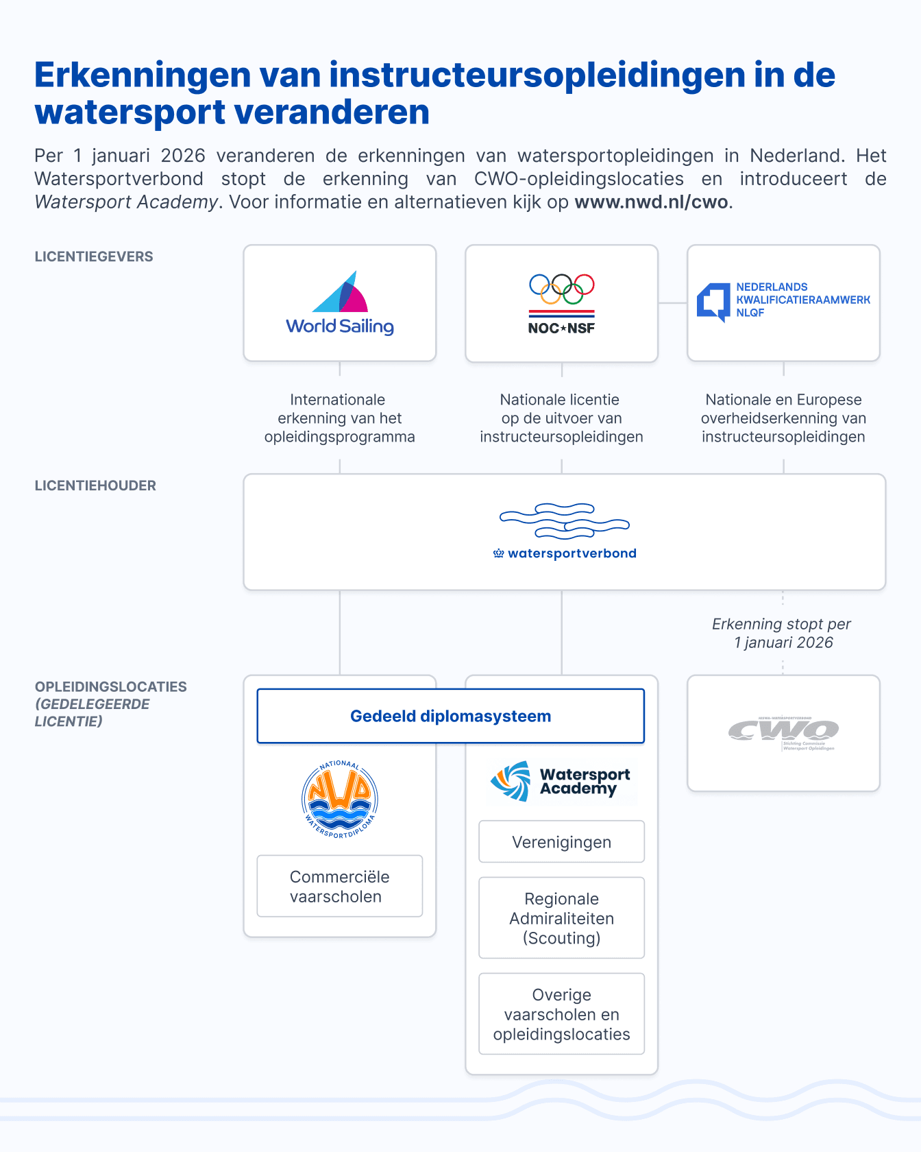 Het Watersportverbond - de nationale sportbond voor de watersport - heeft recent aangekondigd dat onze diplomalijn - het Nationaal Watersportdiploma - per 1 januari 2026 de enige erkende standaard wordt voor watersportopleidingen in Nederland. Daarover schreven we al eerder een artikel (Definitieve keuze gemaakt: NWD-diplomalijn wordt vanaf 2026 de enige erkende standaard).